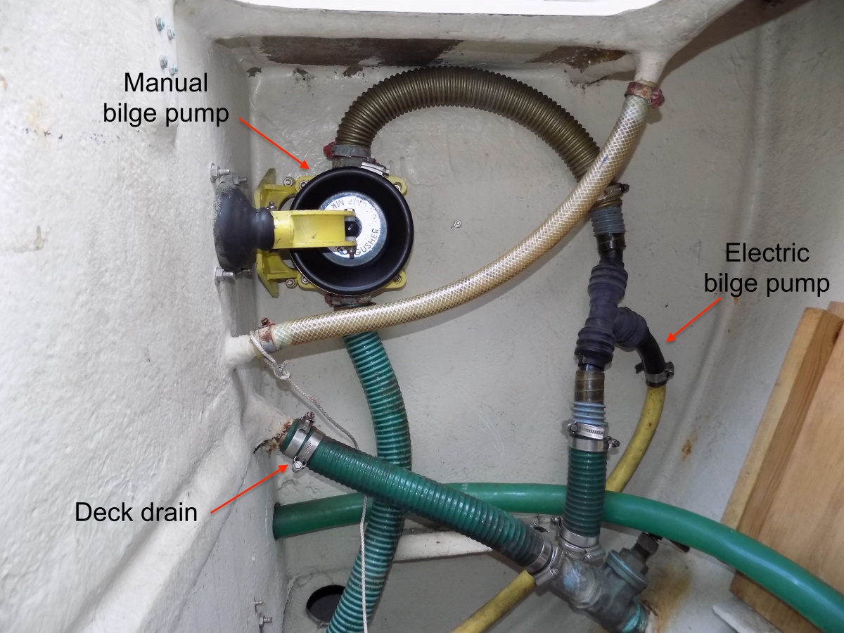 In the example shown, the manual pump would also be restricted by the smaller diameter ’T’ piece fitted for the electric bilge pump. This could easily halve the capacity of the manual bilge pump.