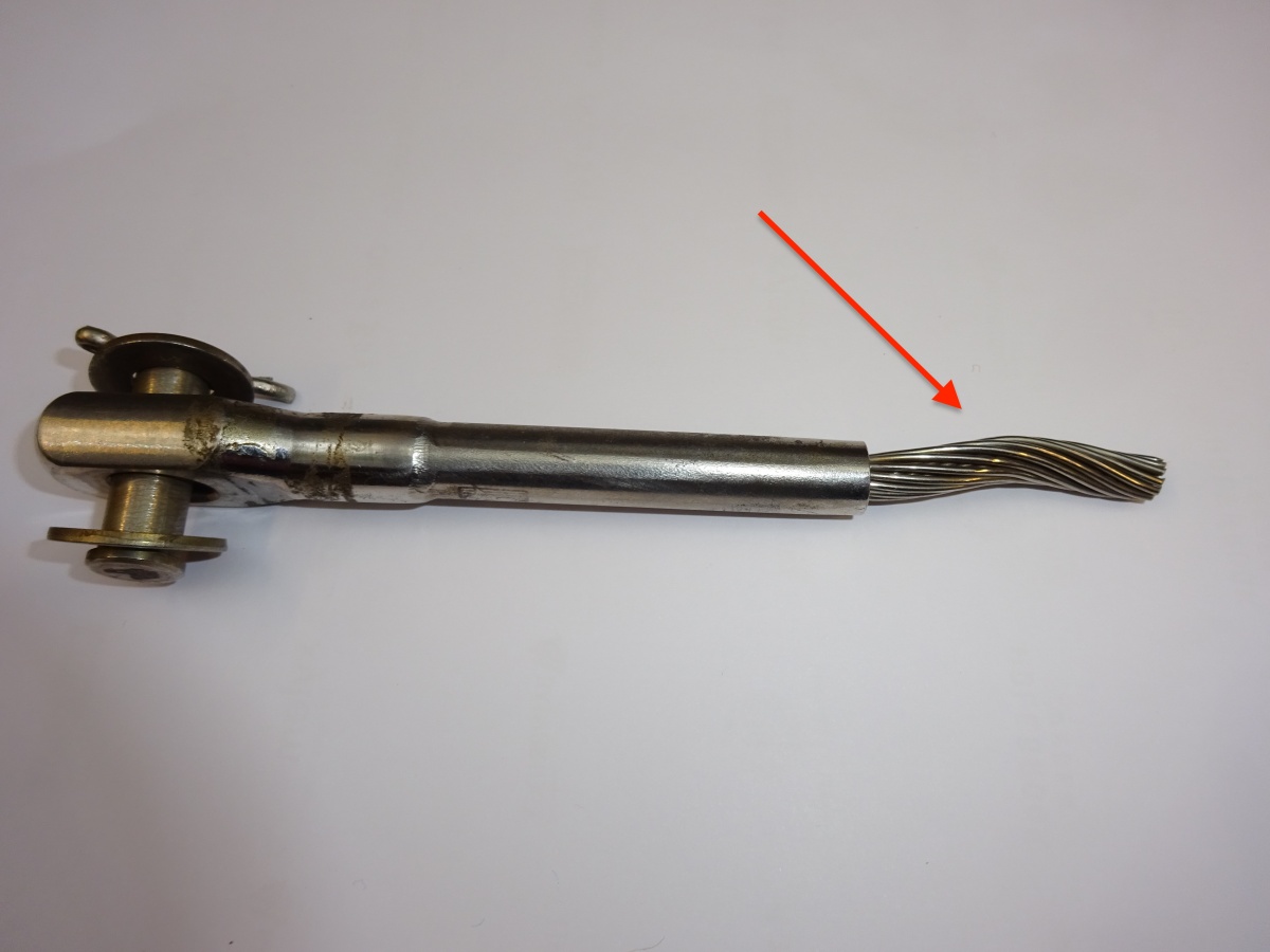 On the mast shown above the halyard has already wrapped itself around the forestay foil. As you try to unfurl the sail, the twisting load is transferred to the stay and you start to unwind the wire strands of the forestay. Eventually this can lead to the failure of the wire and a dismasting. The damaged wire looks like the second image.