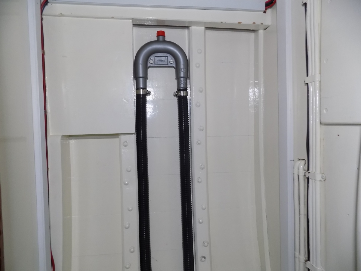 Swan necks should rise above the sea level by at least 8” or 200mm when heeled over. In practice this is normally limited to below the side deck. The anti-siphon valve is a small one way valve inserted in the top of the loop that is normally closed. When you finish pumping and the water level tries to drop back to sea level and small vacuum is created inside the loop which forces the valve open and allows air into the pipe. This breaks the siphon and prevents water flooding back into the vessel.