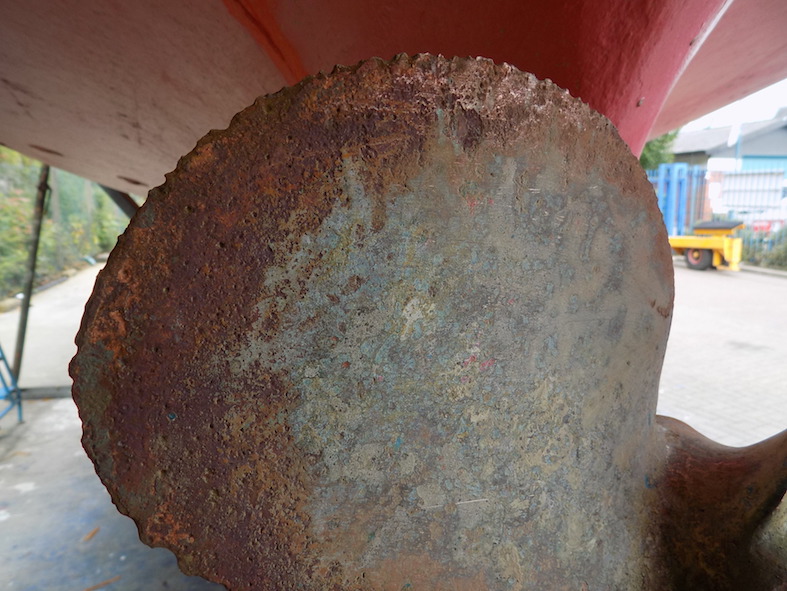 Electrolysis is more of a problem and can cause severe corrosion very quickly even if you have galvanic isolator fitted on board. The propeller in the picture below was fitted to a yacht with a galvanic isolator but still suffered electrolysis so severe the propeller as beyond repair and had to be replaced. This type of damage will often only become apparatent when the vessel is lifted for its annual inspection or repair. If electrolytic damage is found it is worth conducting a test for stray voltage in the water around the vessel by hanging a silver chloride reference cell with a multimeter to determine if there are stray voltages at each skin fitting.