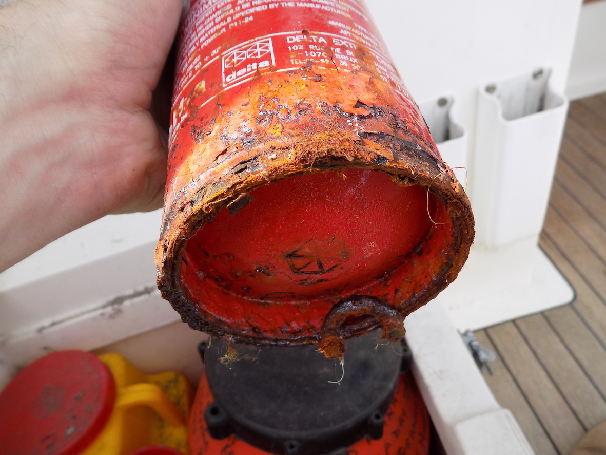 Fire extinguishers are one of those items like most safety items that you only use when you really, really need them! I have surveyed many boats with extinguishers that are out of date and often have no pressure in left in the bottle so they are only good for ballast and in the case of the extinguisher in the picture, not even safe for that.